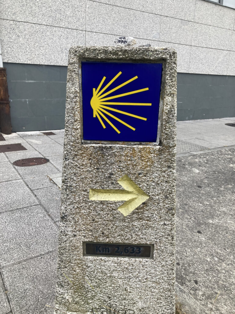 目印となる石塔には、サンティアゴ・デ・コンポステーラまでの残りの距離は 10㎞ を切り、いよいよ1桁に突入。この数字を見て、体が軽くなるかと期待したが、反対にどっと疲れが押し寄せる。
