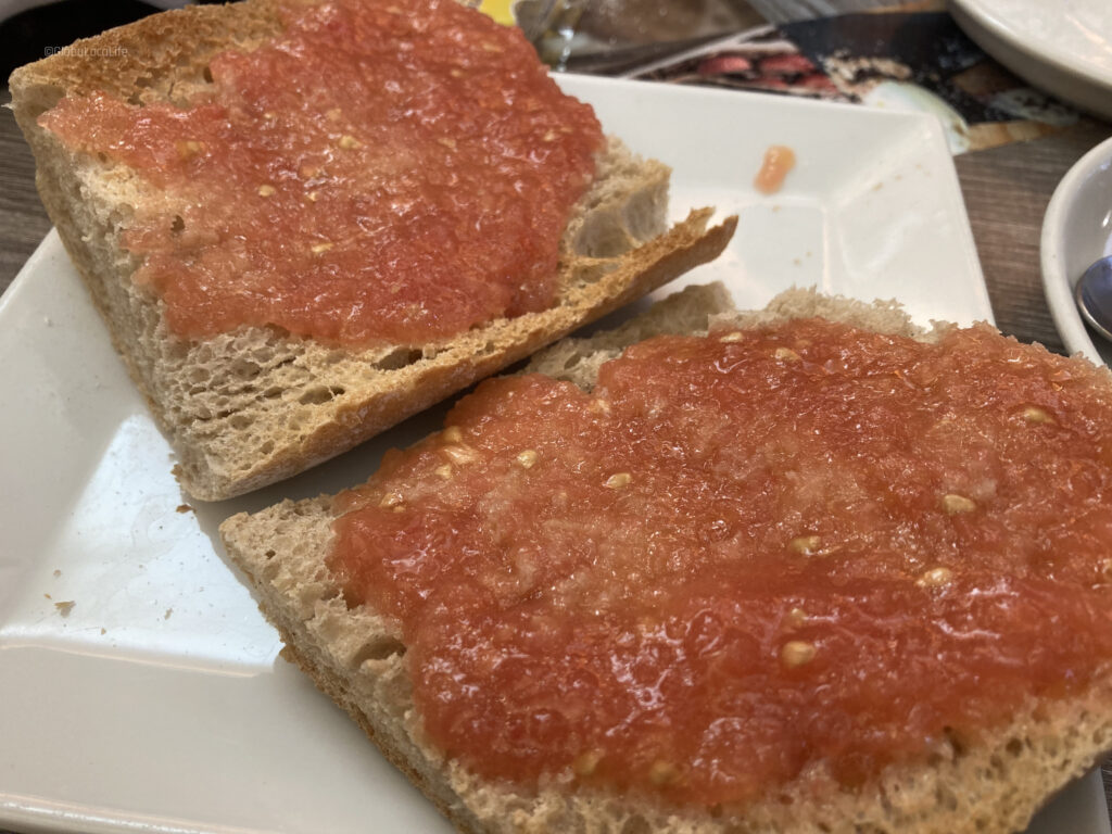 宿の周辺は、巡礼者および観光客向けの飲食店やカフェが多く、朝食のメニューが8-10ユーロと少し割高。少し中心地から離れると、パンにトマトソースだけ塗ったシンプルなスペインらしい朝食にコーヒーで5ユーロ前後と、リーズナブルな場所が見つかり、ペドロと一緒に朝食を取る。