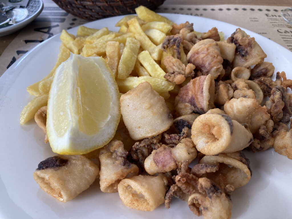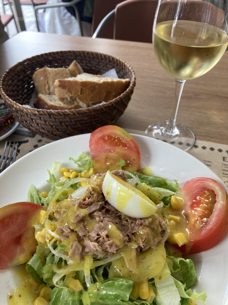 前菜のサラダ、メインのイカフライと家庭的な料理。昼からワインを呑む生活も、巡礼が終わればしばらくはお預けとなるので、最後の1杯を存分に味わう。