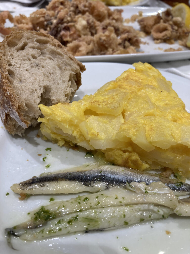 ショーケースに並んだタパスが食欲をそそるレストランはどこも満席。この手のレストランの客の回転率は遅いので、残念ながら順番が回ってきそうにもなく、そのまま近くのレストランへ。