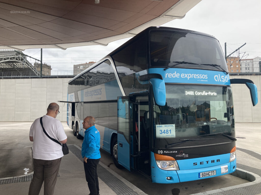 バスの運行スケジュールは午前9時30分にサンティアゴ・デ・コンポステーラ出発、午後12時30分にポルト到着、バスを乗り換えて午後1時15分にポルト発、午後4時35分にリスボン到着。運行時間は7時間20分。