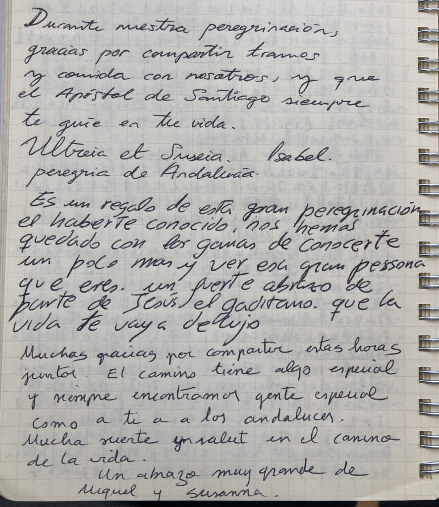 こんな素敵な巡礼仲間から、最後に日記帳として使用していたノートにメッセージをもらう。さらに、記念に持って行ってと、ペンとピンバッチのプレゼントをいただく。