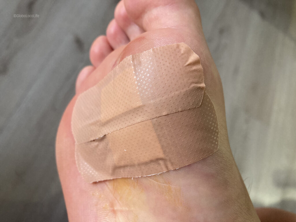 踵の靴擦れよりも、足の裏のマメが潰れた箇所が、地面に足を付く度に痛む。消毒をして、絆創膏を 2 枚張り。さら足全体にワセリンを塗って靴下を履く。トレッキングシューズを履く瞬間、踵の靴擦れとマメが刺激を受け、思わず声を上げてしまうほどの激痛が走る。一連の処置のせいで、準備に化粧をしているかのように時間を取られる。