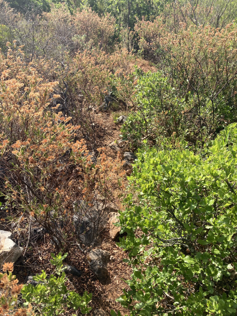 すると、開けた歩道まで脱出することができた。この時の安堵感たるものや。どうしてこんなにも迷ってしまたのだろうか。再び様子を見るために、この歩道らしきところを進んでみるが、やはり行き止まりのように途中で道がなくなり、草木の壁が立ちはだかる。ここに戻ってこれただけでも幸運だ。おとなしく引き返そう。