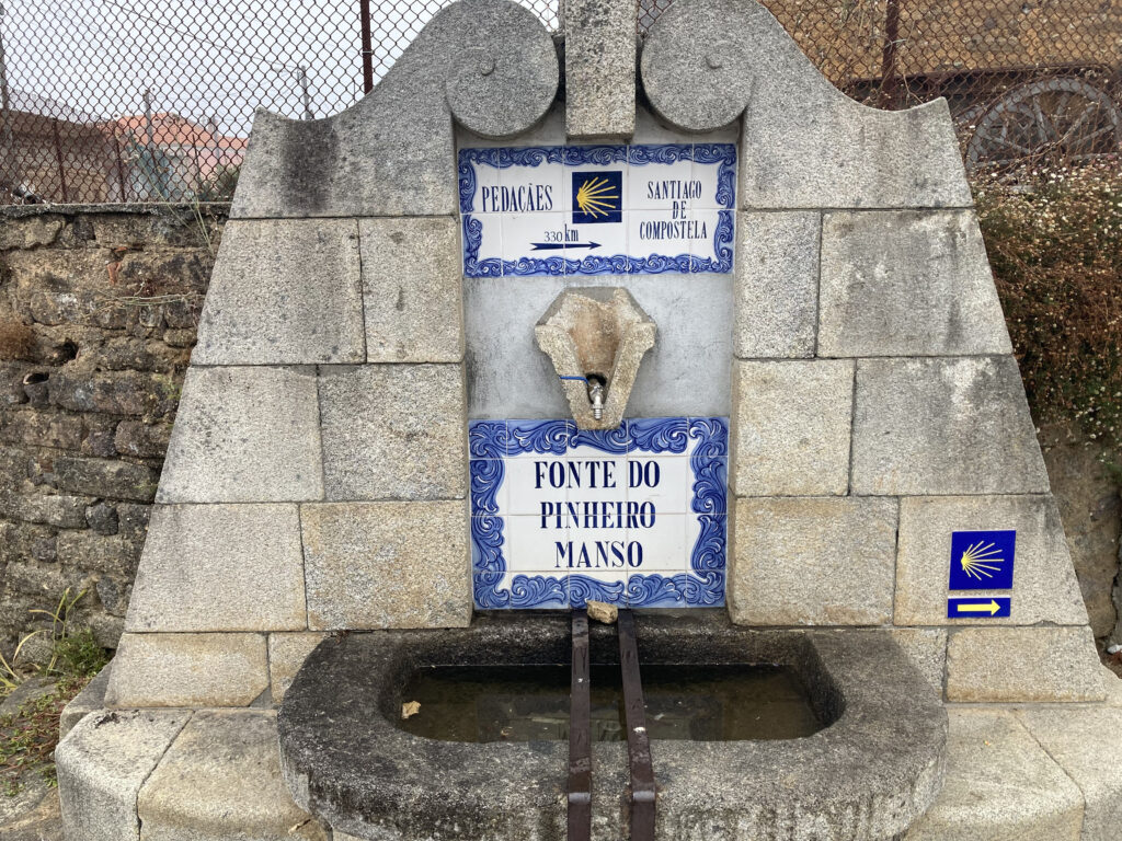 足の痛みは相も変わらずだが、この日も気合を入れてトレッキングシューズに痛む足をねじ込み出発。アゲダの街を後にして Pedaçães 村に入ると、サンティアゴ・デ・コンポステーラまで残り 330km の表示が飛び込んでくる。出発地点のリスボンから最終目的地までは 600㎞ ほどの距離だったので、およそ半分くらいまで進んできたことになる。
