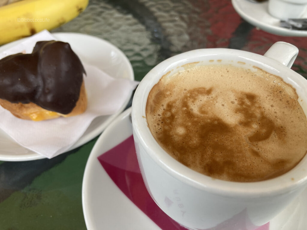 結局、出発から最初のカフェが現れるまで3時間、ノンストップで歩き続ける。このスペイン人たちの体力はなかなかのものだ。ようやくたどり着いたカフェで、コーヒーとチョコレートのかかったミニエクレアのようなパンを頂く。