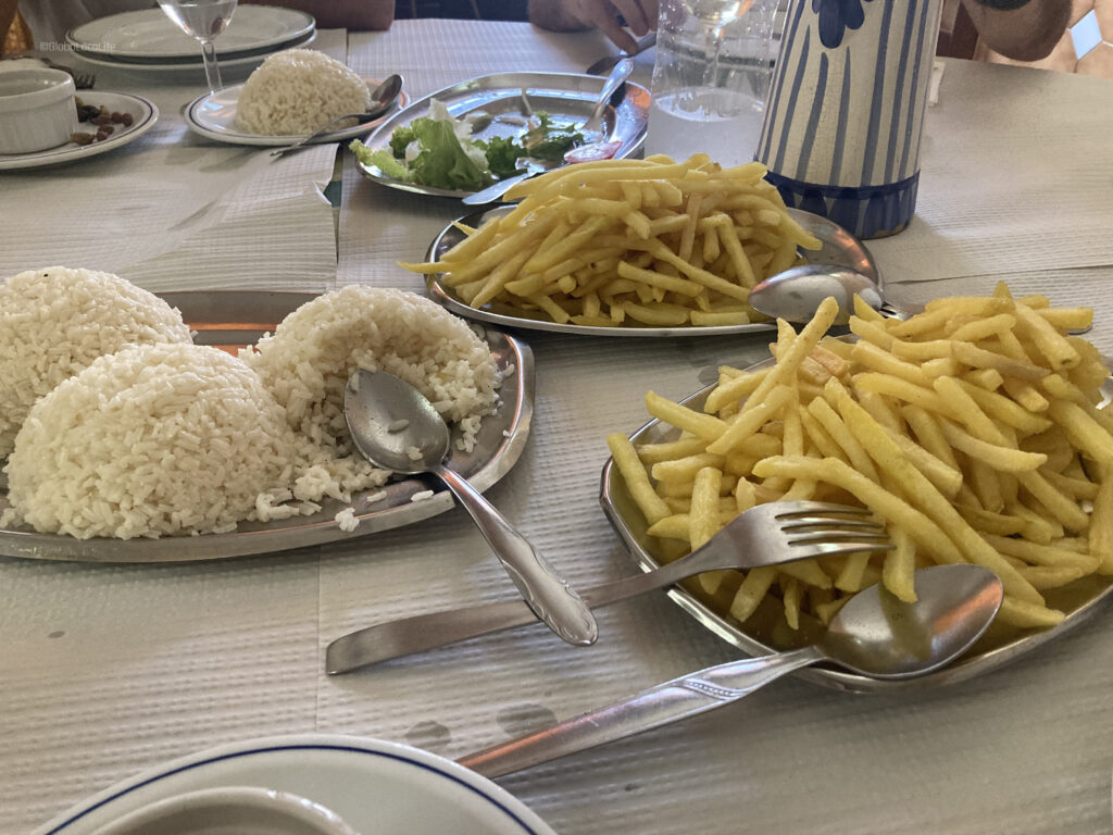 スープとサラダの前菜を食べ終えると、フライドポテトと米が運ばれてくる。文字通り、山盛りの米。日本ではお米の値段が上がっているので、大盛の米をありがたく頂こう。