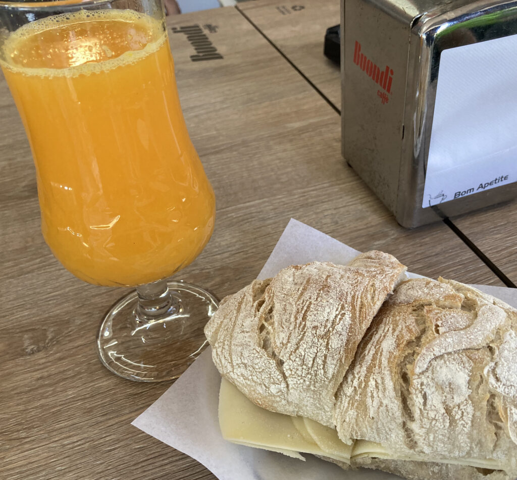 フレッシュオレンジジュースが飲めると、朝のテンションが上がる。カフェでもおしゃべりに夢中になっていると、後からもう2人のスペイン人たちが合流。いつもの6人全員集合となり、話が一向に止む気配はなく、気が付けば45分近く休憩していた。