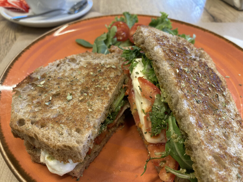 この日の曇空は肌寒さを感じるほどで、ジャケットを羽織ってくるべきだった。2駅ほど歩いたら、車窓から目を付けて置いた Angola Café へ。店名のようなアフリカ感はまったくなく、カプレーゼサンドとカプチーノを注文。合計6.5ユーロ(=約1,100円)。観光客で賑わうポルトの中心部と比較すると、リーズナブルな価格。