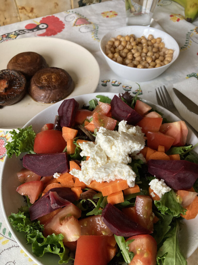 サラダにマッシュルームのソテー、ひよこ豆のマリネで軽めの夕食。ランチの際にワインを500ml 飲んだので夜はアルコールは控える。