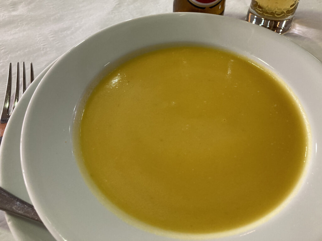 ランチメニューはなく、アラカルトからスープ、イカのフライ、ワインを飲みたかったが一杯4.5ユーロと割高感が否めなかったので、ビールで代用。