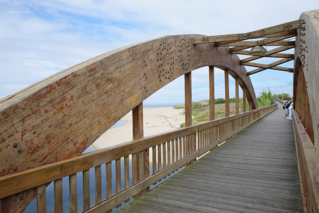 コーヒーブレイクでエネルギーをチェージしたところで、再び歩き始める。Foz de Rio Onda に到着すると、河口と海が交わる地点の自然の風景にマッチすような木造の橋が現れる。隈研吾氏の作品かのような木の使い方。
