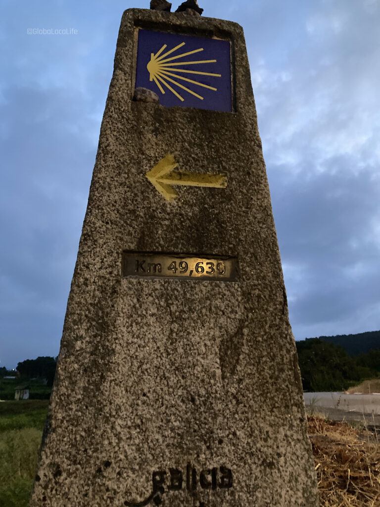 まだ街灯が明るく輝く時間だが、道案内となる巡礼の矢印の石塔には、サンティアゴ・デ・コンポステーラまでまでの道のりは残り 50km を切り、49.63㎞ と表示されている。残り2日間で、それぞれ 約25㎞ ずつほど歩けばゴール。そう考えると、心理的に一気に近づいたような錯覚に陥る。そんな高揚感に水を差すかのように、野生のイノシシが目の前を猛スピードで横切っていく。大丈夫だろうか?この巡礼路…。