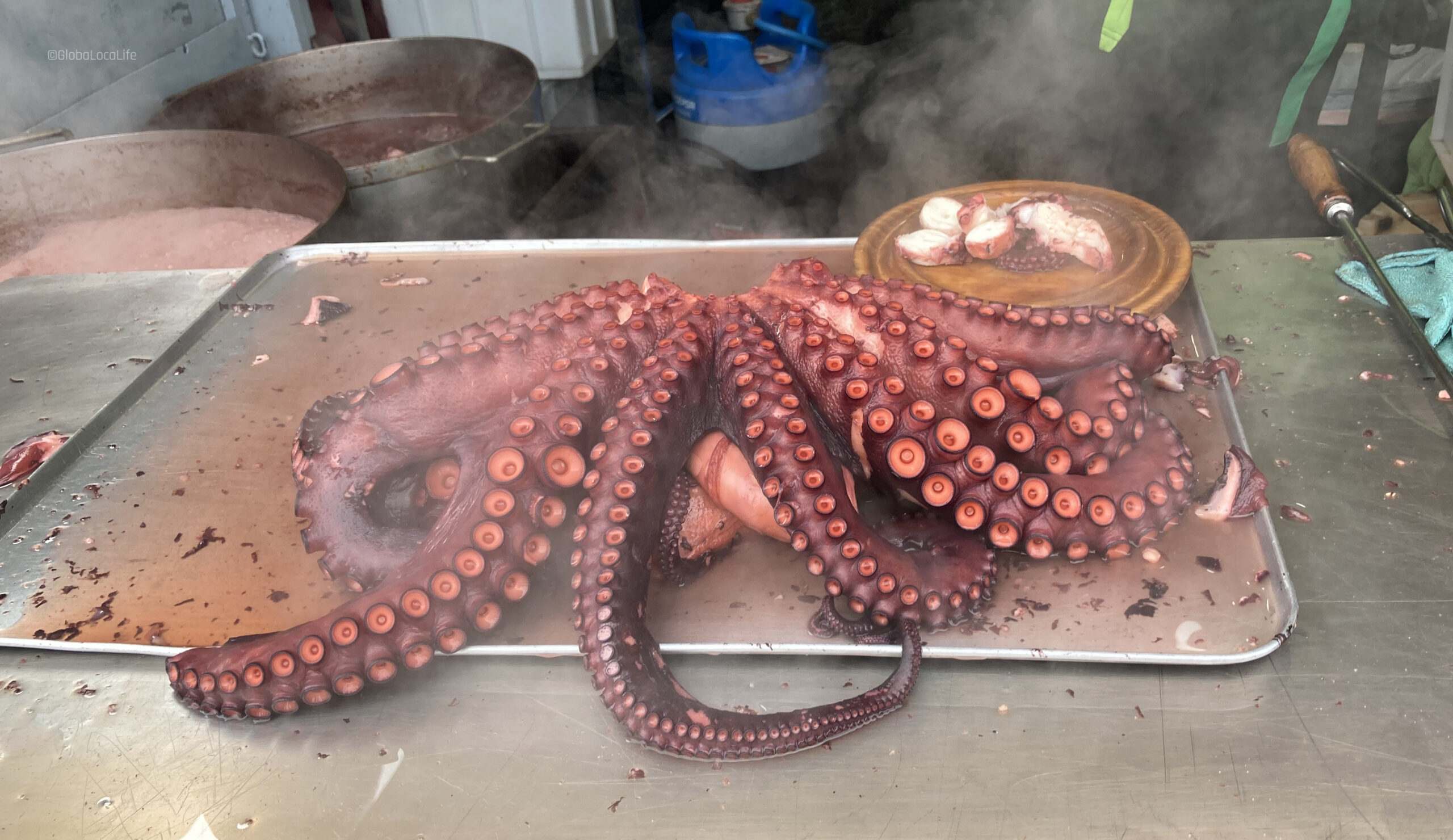 そういう時は、地元の名産かつ、賑わっている店に限る。週末マーケットに出店するテント張りの店舗だが、行列ができるくらいのタコ料理屋さんへ。