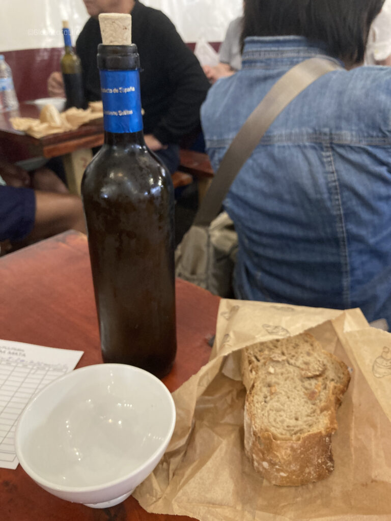 注文を取ってもらえそうにないくらいの繁忙。店員ごとに担当する座席のエリアが決まっているようで、担当の店員をつかまえて、何とか注文にありつく。待っている間は、白ワインを楽しむ。視線の先には、この日、巡礼路の休憩前後で何度か追い抜かした巡礼者がいたが、目が合って軽く会釈するくらいで、互にテーブルをシェアするような雰囲気にはならず。