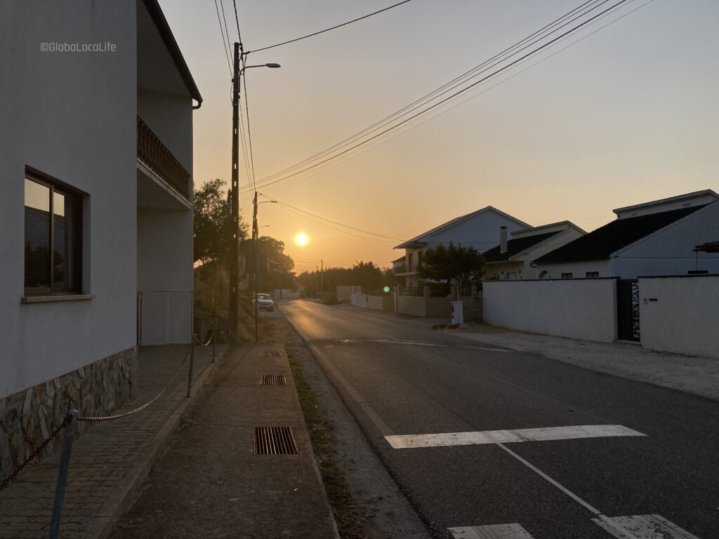 目指す方角は北東。出発して間もなく太陽が目の前から昇り始め、朝焼けに照らされる。ファティマで購入した4ユーロのサングラスの出番。