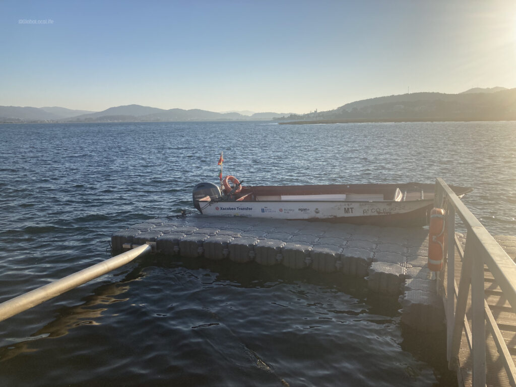 そもそも出発時間は7時30分、まだまだ時間はある。出発10分前になり、1台のボートが姿を現す。これでスペインまで渡るの?と一瞬ためらったが、ボートには前日にチケットを予約した「Xacobeo Transfer」の文字。