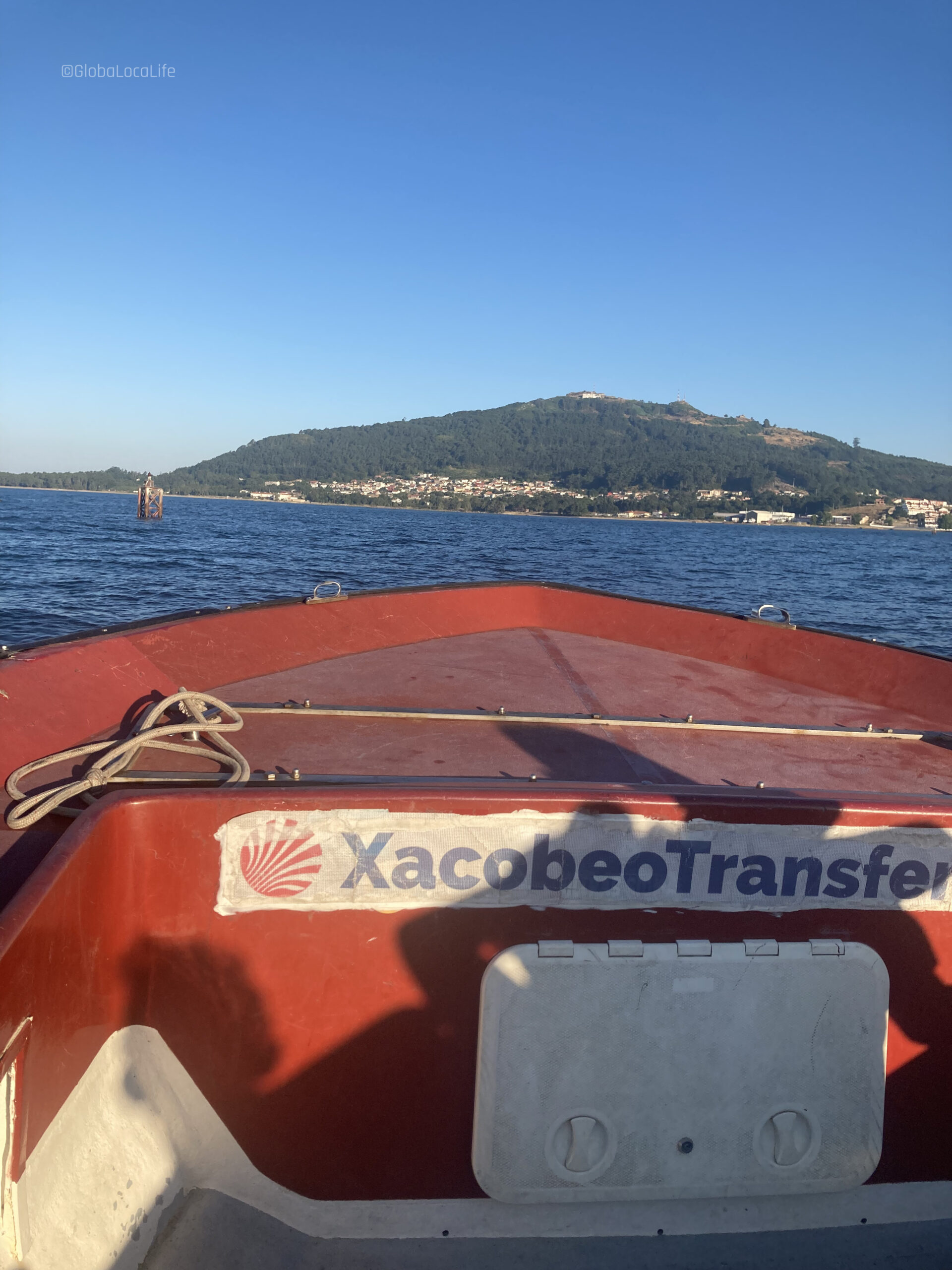 そもそも出発時間は7時30分、まだまだ時間はある。出発10分前になり、1台のボートが姿を現す。これでスペインまで渡るの?と一瞬ためらったが、ボートには前日にチケットを予約した「Xacobeo Transfer」の文字。