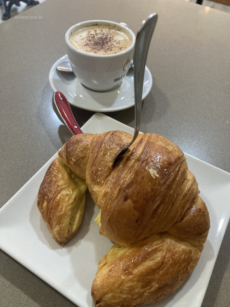 スペインでは珍しくカード払いができないカフェで、店内は他の巡礼者はおらず、地元客のみのローカルな雰囲気が漂う。チョコレート系のパンを体が求めていたが、カフェにあったのはクロワッサンのみ。