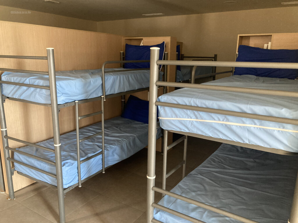 10ユーロ(=約1,700円)にしては、設備はきれいに整備されているが、いかんせん1部屋に20人以上が寝る大部屋。出入り口付近を避けて、奥の下の段のベッドを確保。