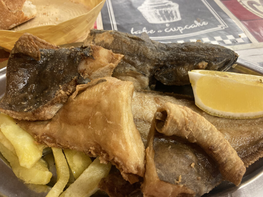 メインの魚のフライは、前日の仕入れの残り物の魚たちの鮮度が落ちたのを誤魔化すため、フライにしているのかと思いきや、この日の朝に市場で仕入れてきた魚たちという。実際に、食べてみると、臭みは全くなく、冷凍されたような味もなし。レモンが引き立つ新鮮な味わい。フライドポテトも付いていたので、さすがにもうこれだけで満腹。