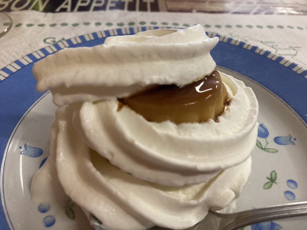 甘いのは好き?と聞かれ、目がないと返答すると、迷わずプリンにたっぷりとホイップクリームをかけ回す。昭和に通じるレトロなデザート。