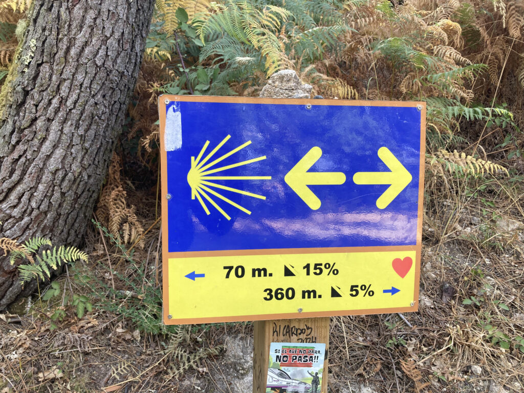 道中に珍しい、道しるべの看板。左手は距離は70メートルだが、上り坂の傾斜が15度の急勾配。一方、右手は傾斜が5度と緩やかな坂だが、距離が360メートル。10人ぐらいグループのスペイン人巡礼者は、看板の前でどちらの道を選択するか白熱した議論を繰り広げている。