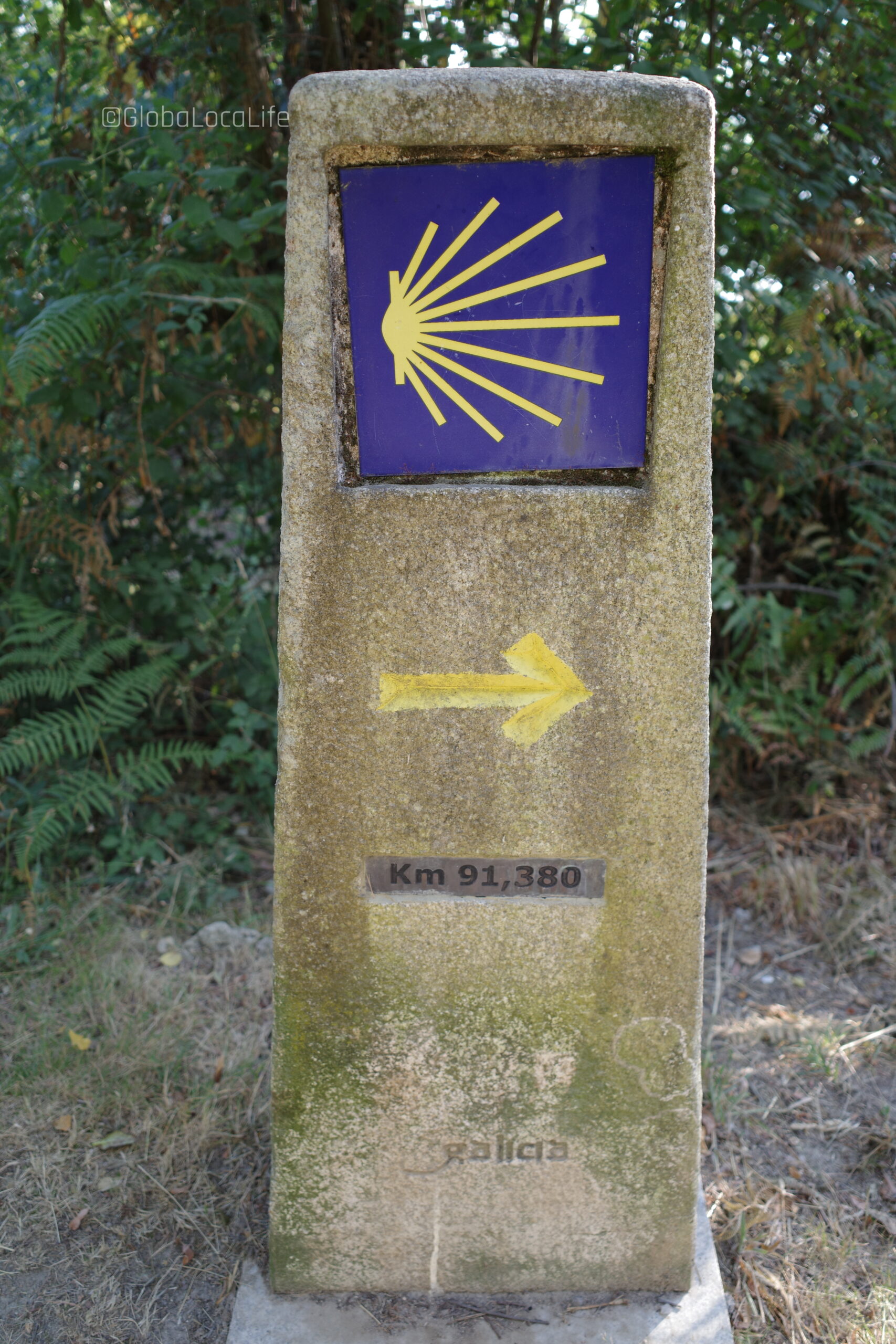急な勾配の上り坂を歩んできたご褒美と言わんばかりに、朝焼けに照らされるヴィーゴの街並みが一望できる。心臓破りのような道を駆け抜けてきた甲斐があった。ふと、いつものように巡礼の黄色い矢印に目をやると、サンティアゴ・デ・コンポステーラまでの残りの距離の表示が91.38km と100㎞ を切って、残りの距離が2桁に突入。