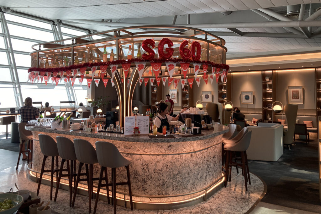 ラウンジ内は、チェックインカウンターのグランドスタッフが言っていた通り、こじんまりとしたスペース。ラウンジ中央部のバーカウンターがちょっぴりシンガーポールらしい雰囲気を演出している。利用客はいるものの、混雑を感じさせるほどではない。