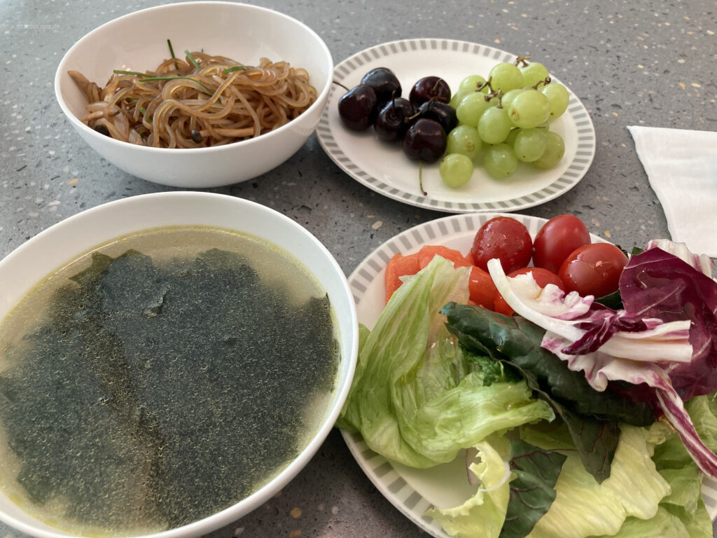 朝ごはんとしてラウンジ飯を頂くので、少し軽めにフルーツとサラダ、わかめスープにチャプチェをチョイス。