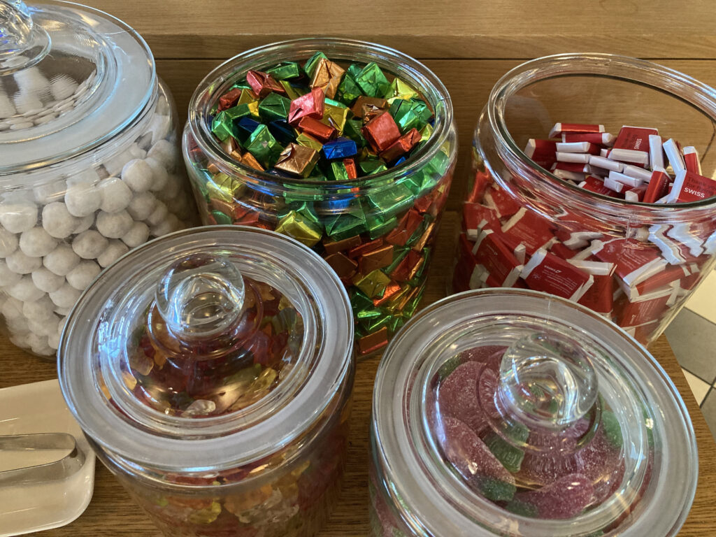 なぜなら、食事のコーナーの一角には、グミやスイスチョコレートのコーナーが設けられているから。ラウンジの利用者の中には、文字通り、わしづかみして持っていく人もいるくらい。