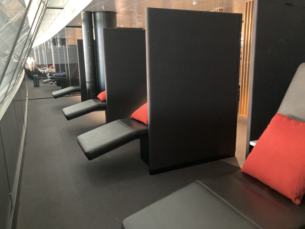セナターラウンジの2階にはサイレントエリアが設けられており、食べ物は持ち込めず、文字通り静かに過ごす空間。足を伸ばして座れるソファがあり、フライト前に足がむくまないように、くつろぐ。