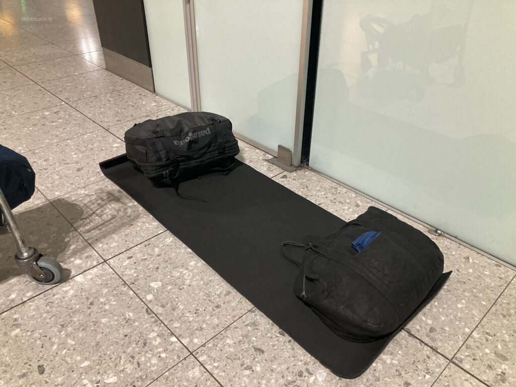 妙案はすぐに浮かぶ。持参していたヨガマットを敷いて、手荷物を枕にして横になればよいのだ。旅行中、朝のストレッチなどで使用したヨガマットが、最後の最後まで役立つとは。
