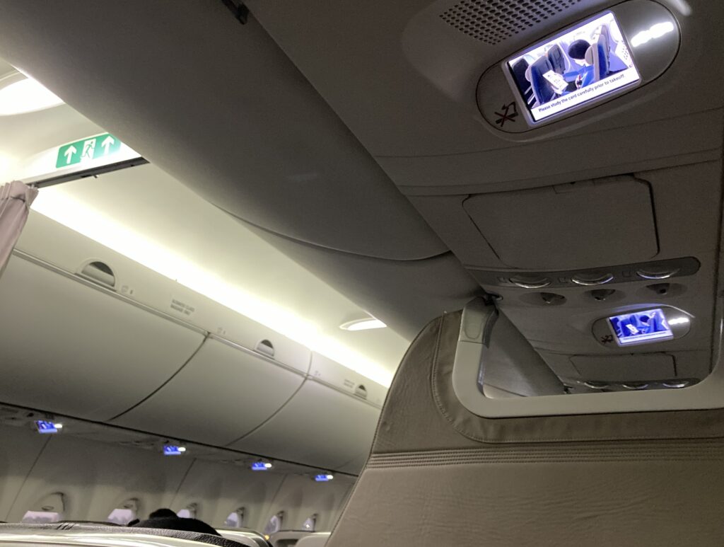 座席は通路を挟んで2-3席のユニークな座席配置。この日のエコノミークラスの搭乗率は100%には届かず、横の席は空席だった。