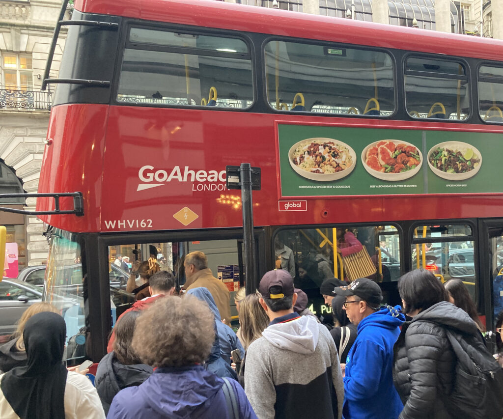 このような歩いたからこそ見つけられた小さな発見に喜んでいるのは旅人くらい。ロンドンで暮らしたり仕事をしたりしている人にとってみれば、地下鉄のストの影響は多大。代替えとなるバスは、この日はどの停留所も多くの乗客で溢れかえっている状態。