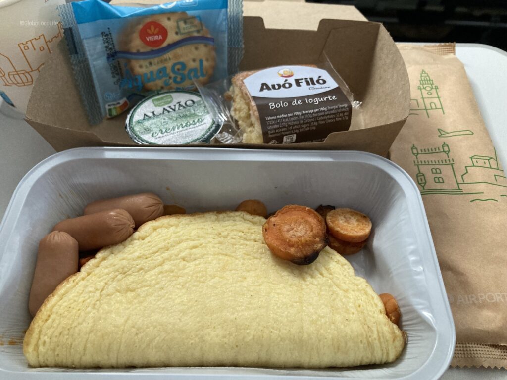 提供された機内食は朝食メニューで、オムレツとスナック。オムレツは、冷凍食品のような見た目に、パリパリ感ゼロの茹でた味のなさそうなソーセージ、しなびて炒められたかのような人参。残念な印象の機内食。