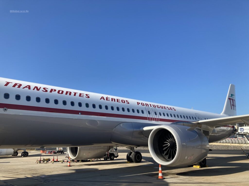 バスで機体の手前まで移動。目の前に現れたのは、緑と赤をあしらった馴染みのあるTAPポルトガル航空の機体ではなく、70年代、80年代を思わせるノスタルジックな機体。これはエモいとでも形容されるのだろうか。