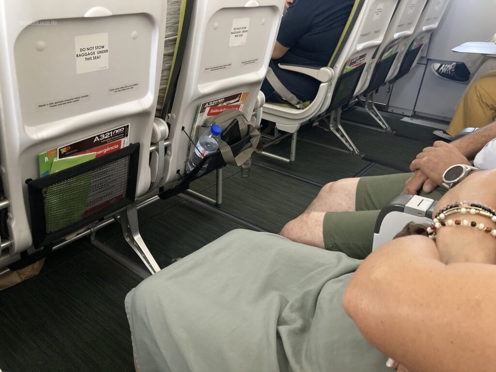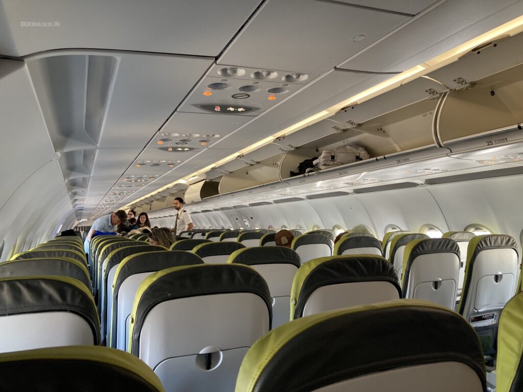 機内は通路を挟んで3-3の配席。夏のバカンスシーズン。当然ながら満席。シートモニターはなく、機体の外観から期待できなかったが…。それでも内部はそれほど古びた印象は受けなかった。